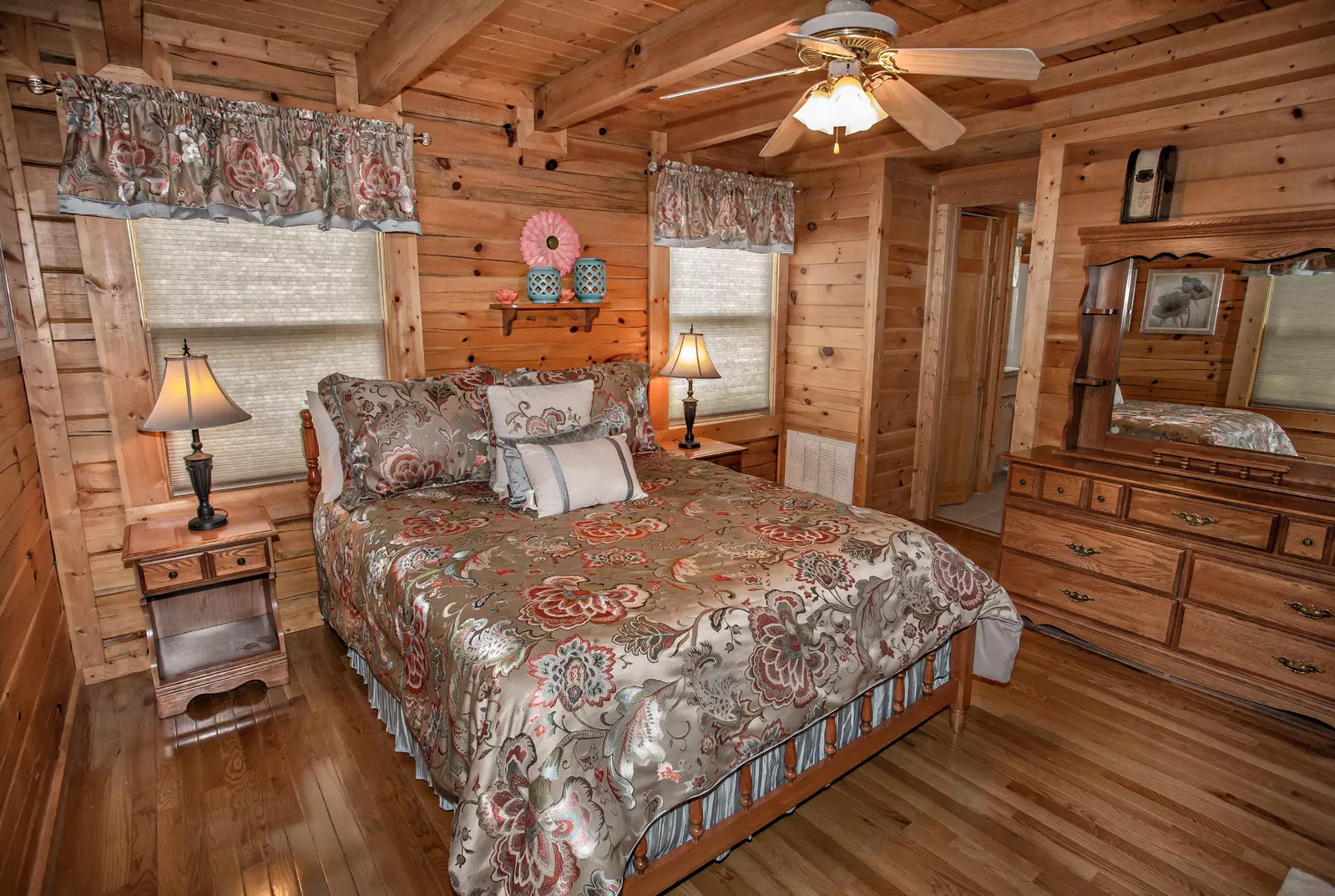 The loft master bedroom has a KING sized bed, a flat screen TV to watch your favorite movies on DVD, a two person Jacuzzi, and a catwalk out to a private covered deck which is nestled under the eaves. This is a great place to simply relax and enjoy the view, either from the two person swing or the Tennessee rockers.