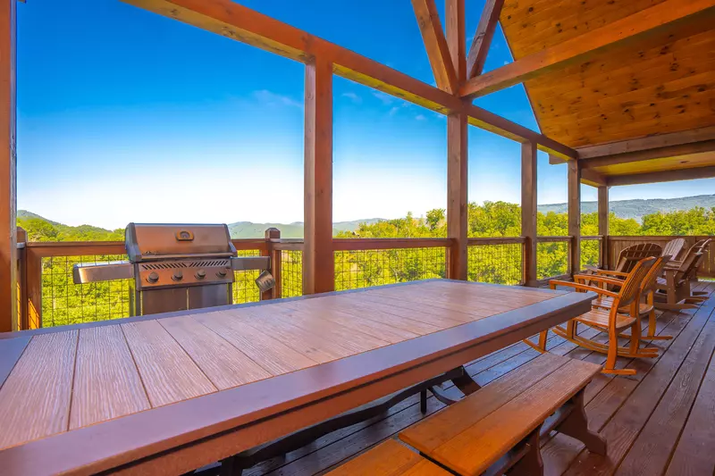Step out onto the expansive, covered deck and enjoy a cook-out on the gas grill. Relax around the patio dining table or in one of the rockers while enjoying the beauty of Smokies.
