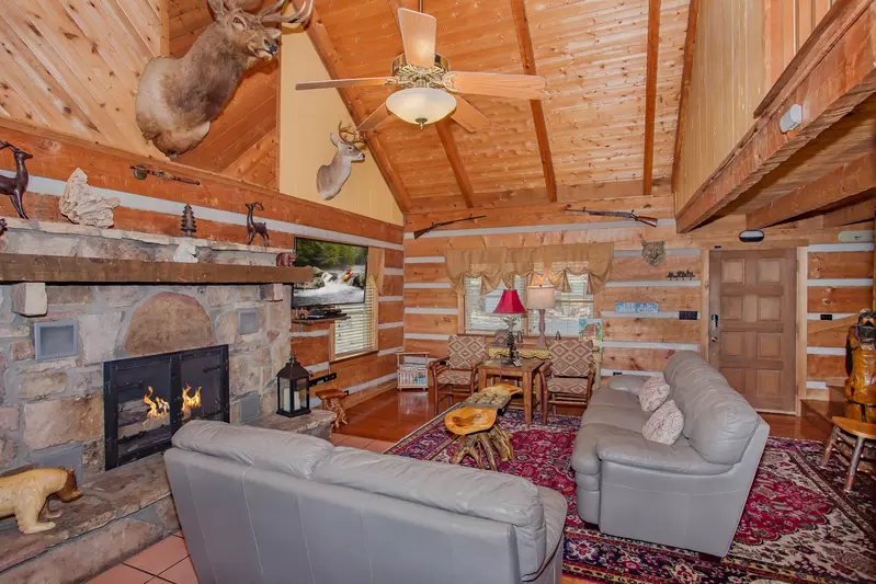 The living room features plush leather furniture, stone gas-fireplace, a large flat-screen HDTV, Cable, Blu-Ray player and Wi-Fi to the entire cabin. The fully equipped, spacious kitchen offers stainless appliances, granite counter tops and a bar counter with seating for 2. The dining table provides seating for 6. A charcoal grill is located just off the front porch for your convenience.