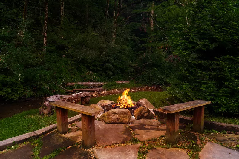 The screened-in deck offers a picnic table, multiple rockers and a soothing Hot Tub where guests can relax and enjoy the burble of the water from the creek. Stepping out towards the water’s edge, guests will find the perfect gathering area complete with fire pit, picnic table and BBQ grill.