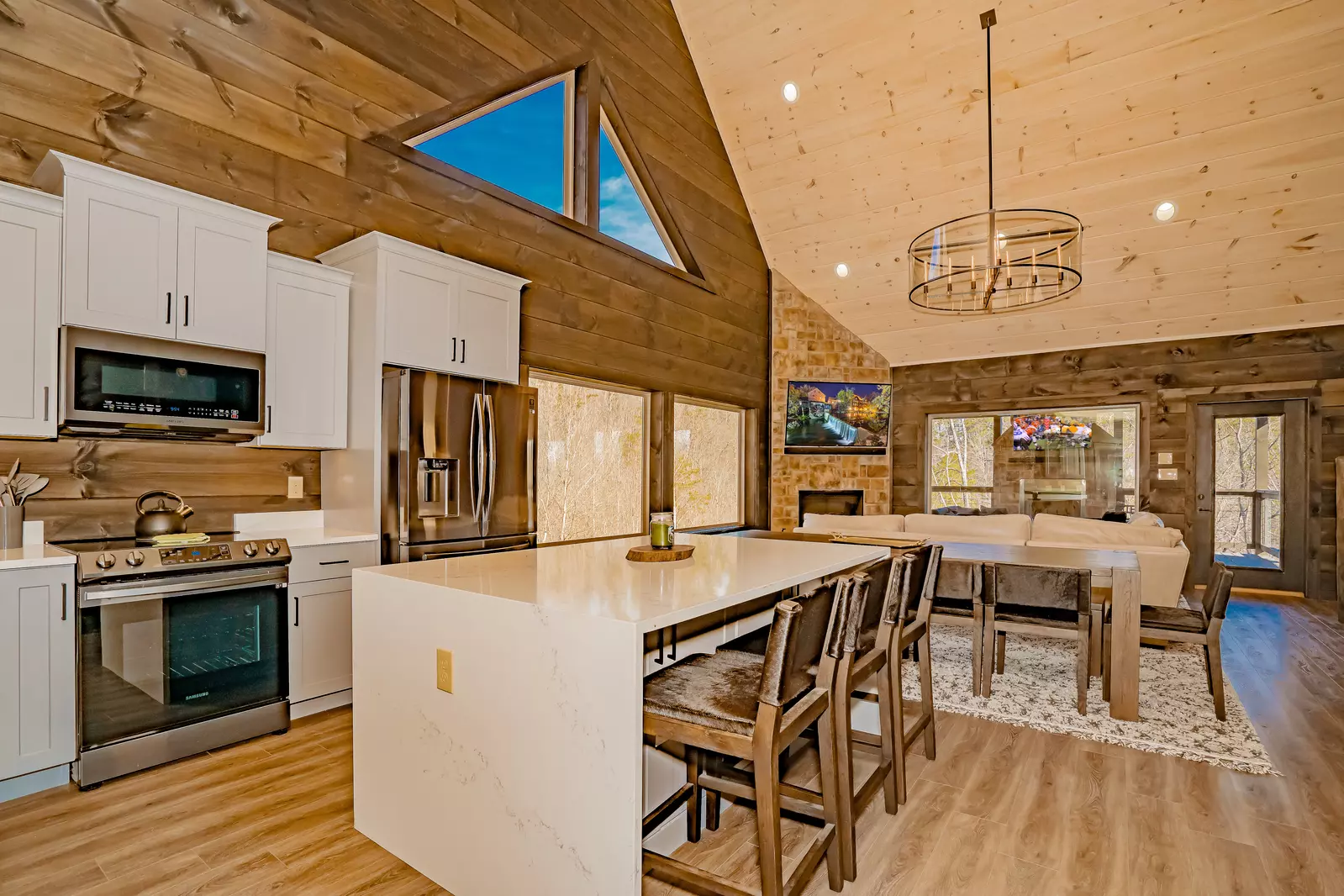 Kick back in the living room on the comfortable plush leather sofa under the 55” modern glass & steel chandelier and let the electric fireplace cast a relaxing glow or catch up on your favorite television show on the smart HDTV! The fully equipped kitchen has all the cookware and tableware necessary to make meal time a breeze. Gather the family and friends to enjoy your culinary masterpiece at the 9 ft reclaimed oak dining table with seating for 10. The island has seating for an additional 3 people, so there's plenty of room for everyone.