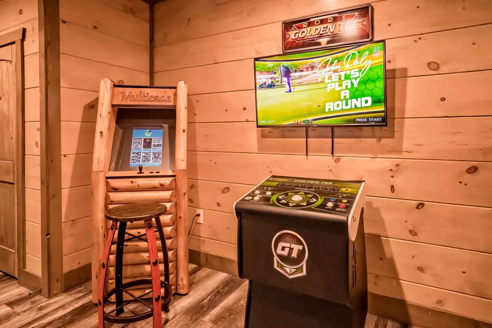 The game room features a pool table, golf arcade, racer games, a child's nook, HDTV, half bathroom, and a multicade arcade!