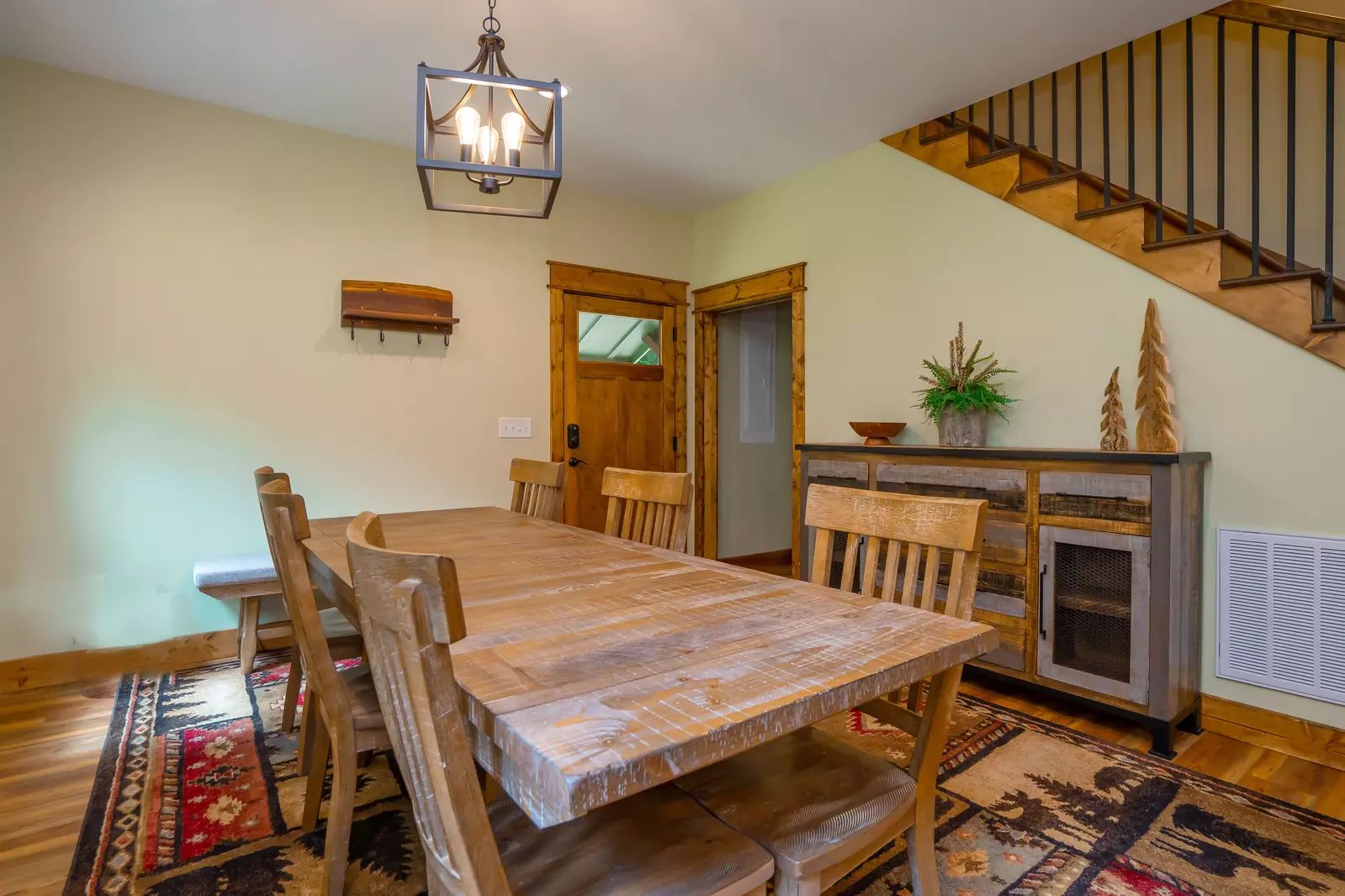 The entry level of this cabin features the kitchen, dining area, living area, a bedroom, a full bathroom as well as a screened in deck and hot tub access.