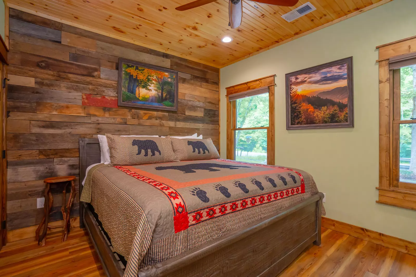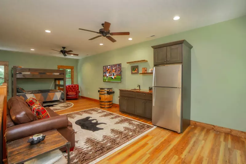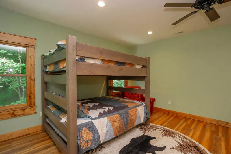 The upper level of this cabin features a wet bar, bunk beds, entertainment area as well as another bedroom and full bathroom.