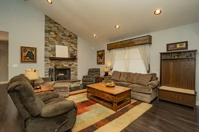 The living room features comfortable seating, an electric fireplace and a huge HDTV. The kitchen is fully equipped and offers stainless steel appliances, granite countertops and seating for 2 at the bar. The dining table provides seating for 8 guests. There is an arcade game in the dining area.