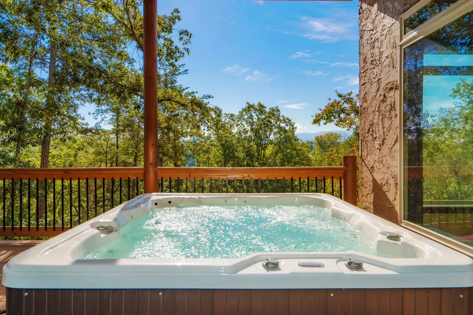 Step outside to the deck and you will find an outdoor dining area with picnic tables, as well as a gas fire pit if you just want to relax and take in the incredible mountain view! There is also a luxurious hot tub.