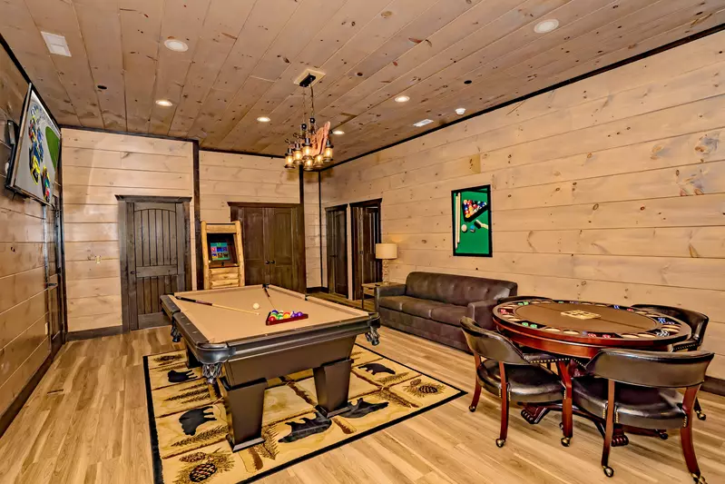 The Game Room features a pool table, poker table, sleeper sofa for additional sleeping accommodations, large Roku HDTV, half bathroom, and a multicade arcade featuring 60 games! The huge theater will seat 16 easily! As if the game room and theater room are not enough to keep you busy, enjoy hours of memory-making in the private indoor pool!