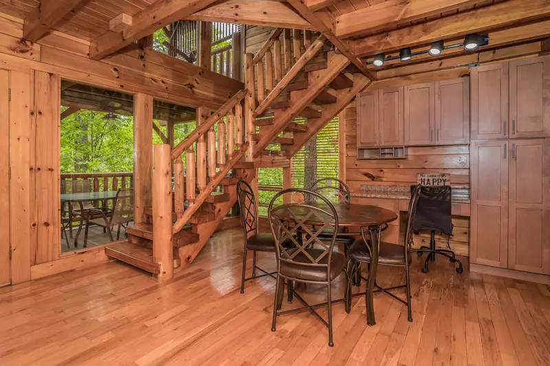 Entry level of this cabin features the living, kitchen, and dining area, 1 bedroom, and 1 bathroom.
