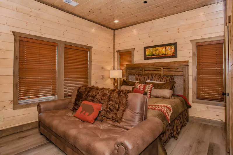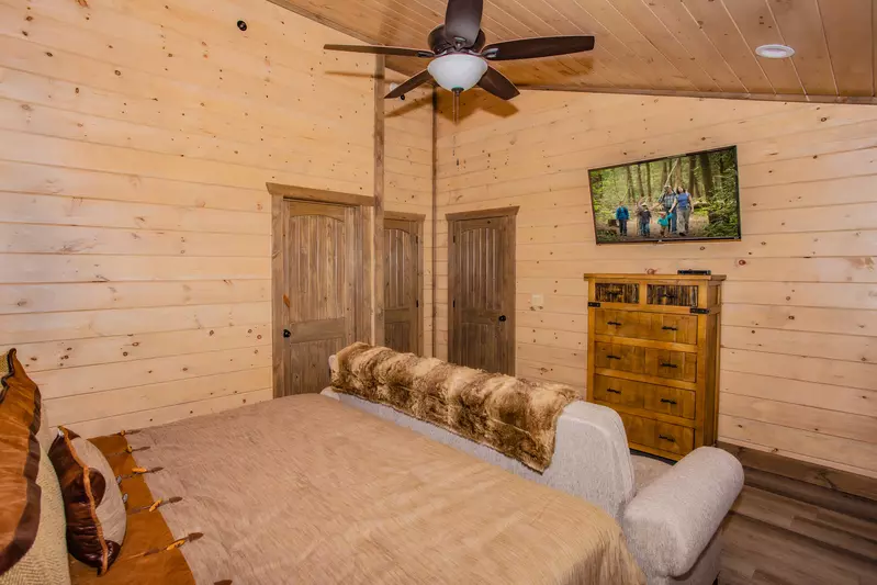 Enter into the bedroom located on this level and you will find a king-size bed, flat screen tv, and attached bathroom with walk-in shower.