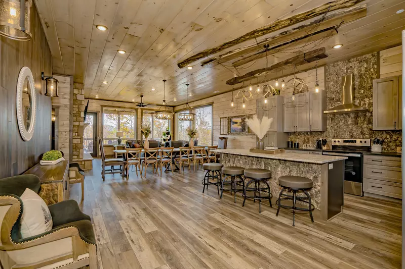 The granite countertop kitchen comes fully equipped for everything you might need to cook those big meals. There is also an island which features additional seating for four individuals.