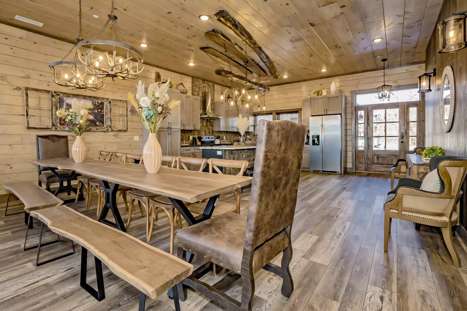 Right off the kitchen you will find the dining room which comes with a long elegant table and seating for up to 14 people. There is also a half bathroom on this level.