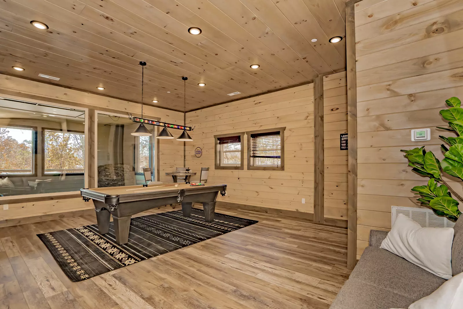 The game room comes with a pool table, arcade game and a large HDTV. There is also a table and multiple other chairs and couches. In addition to this, there is also a futon. The theatre features a huge TV and seating for up to nine individuals. There is also a futon for additional sleeping. The indoor swimming pool is on this level as well.