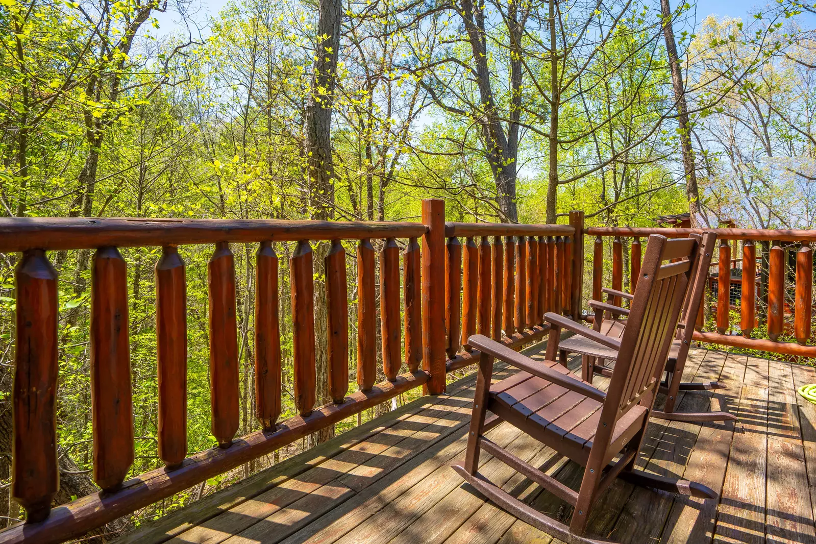 The main level of this cabin features a front porch with a bench swing, the Kitchen,Living Room, 1 Bedroom, 1 Bathroom and a private deck with a hot tub.