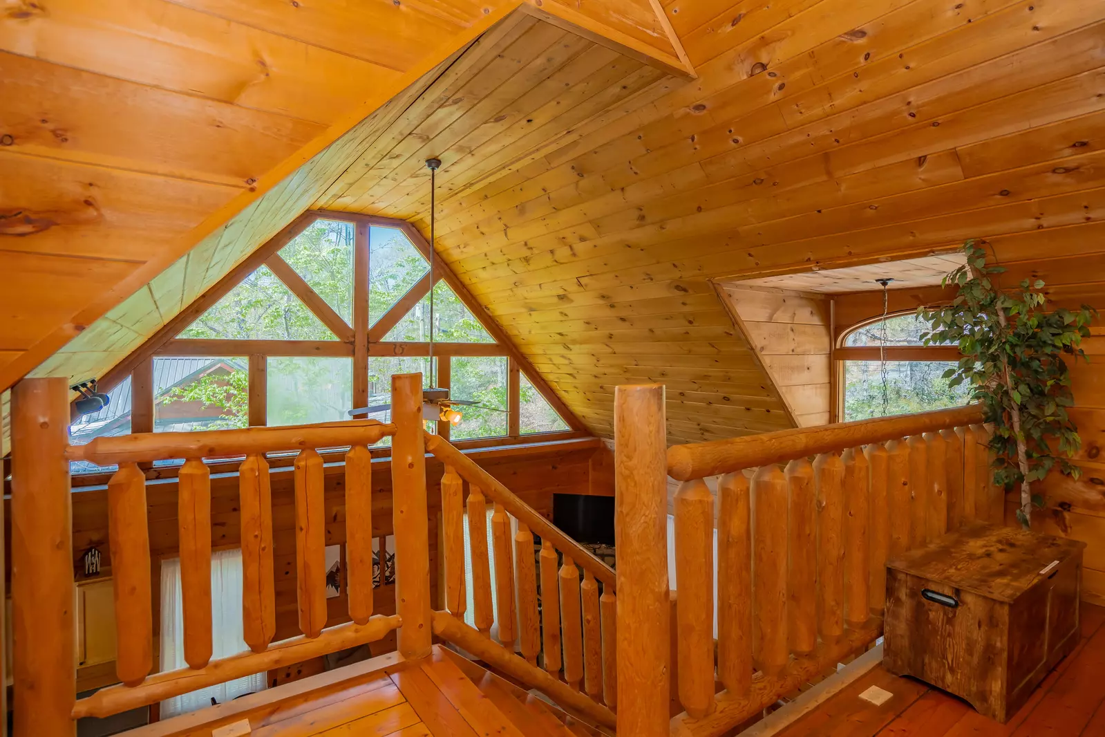 The upper level of this cabin features a loft style entertainment room with a pool table