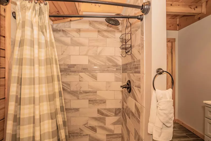 Just down the hall, the bedroom offers a king bed, HDTV, and an adjoining full bathroom complete with a tiled walk-in shower.