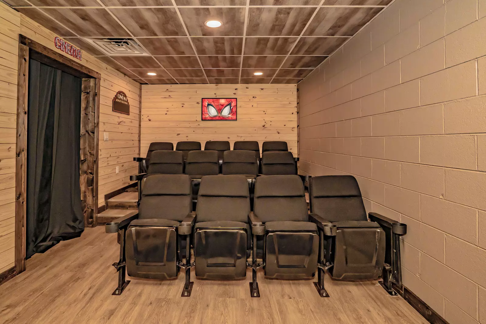 Downstairs you’ll find the theater room, game area, and two additional bedrooms.