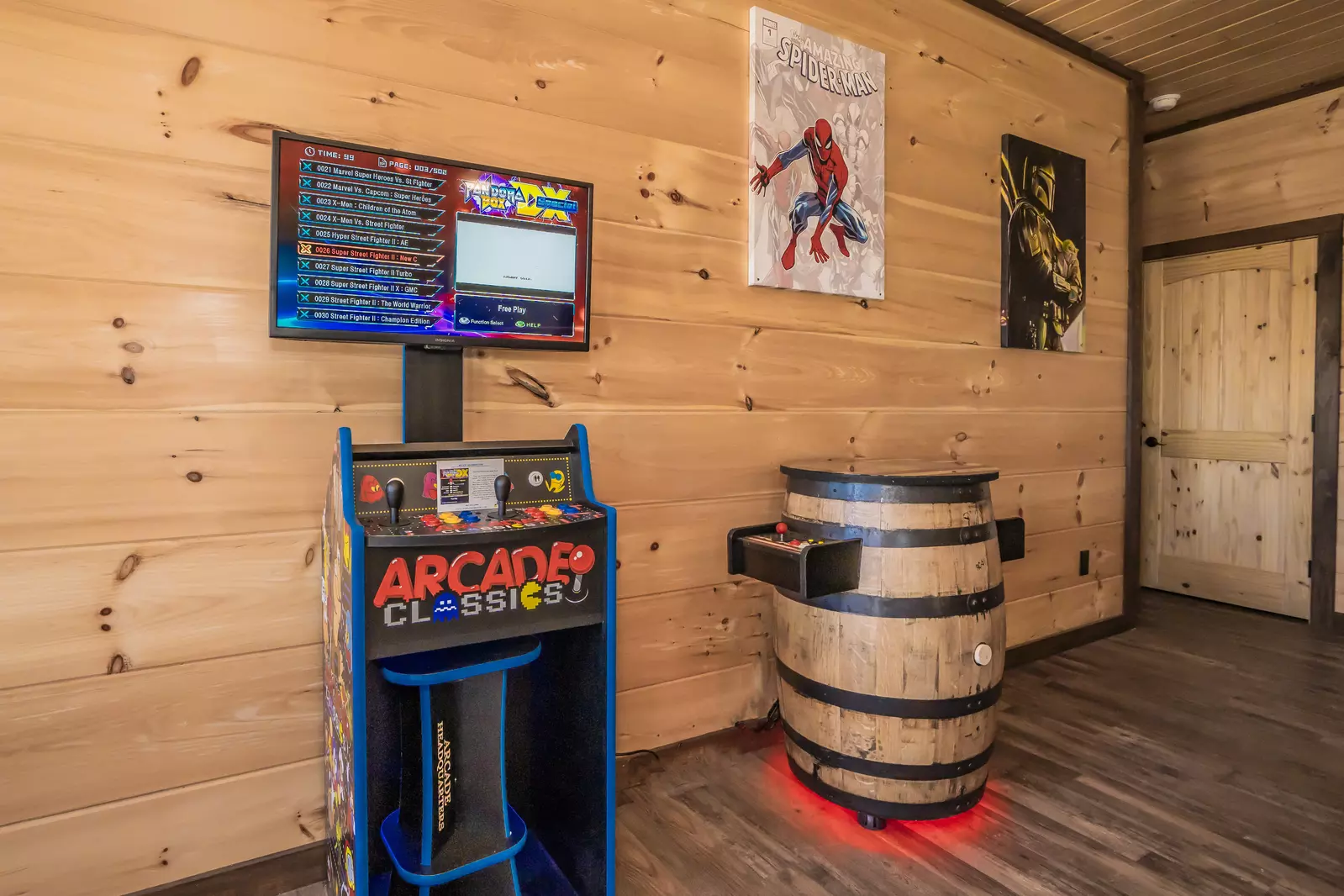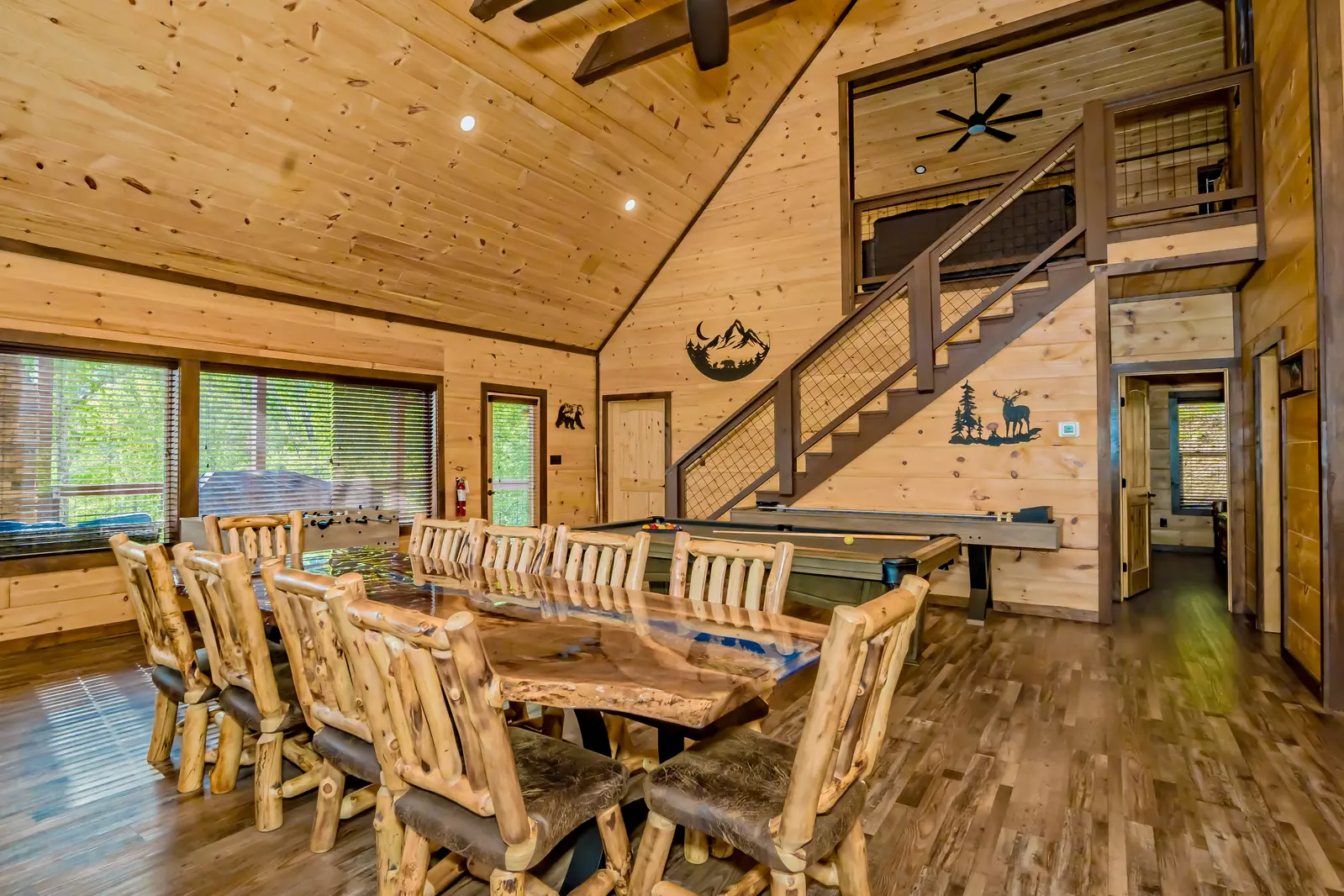 The upper floor includes a spacious open loft room with 2 queen bunks, a lounge area, a large flat screen HDTV, an arcade game, a half bath, and access to the Juliet balcony with seating for relaxing while taking in mountain views.