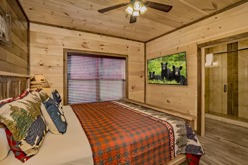 One bedroom features a king bed, flat screen HDTV, and an attached bathroom with a tiled shower.