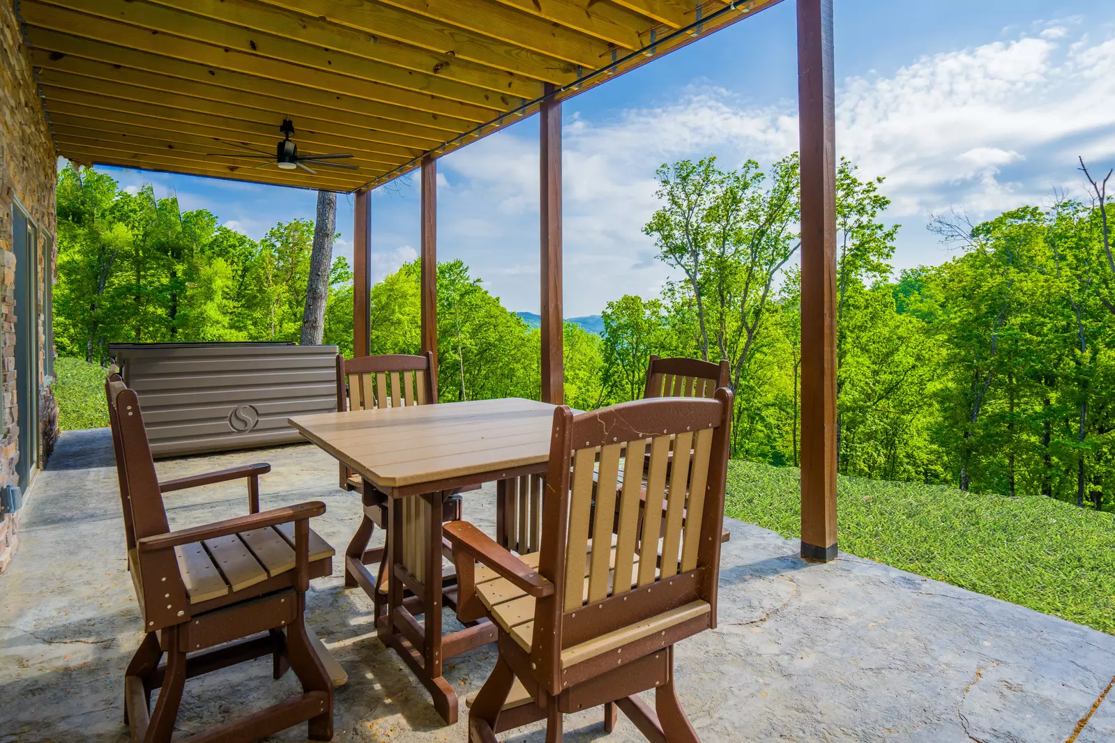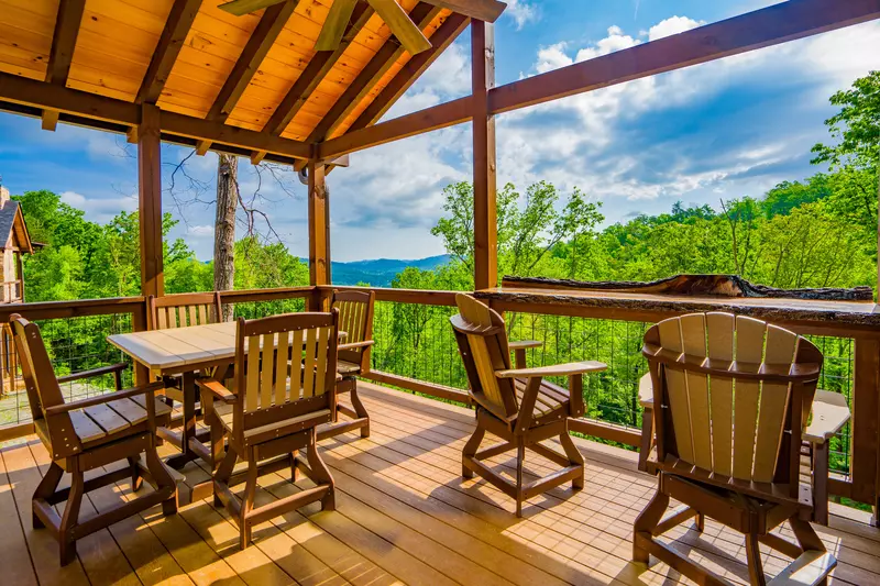 Enjoy the spacious deck with breathtaking mountain views, comfortable patio furniture, and a large gas grill perfect for breakfast or grilling.